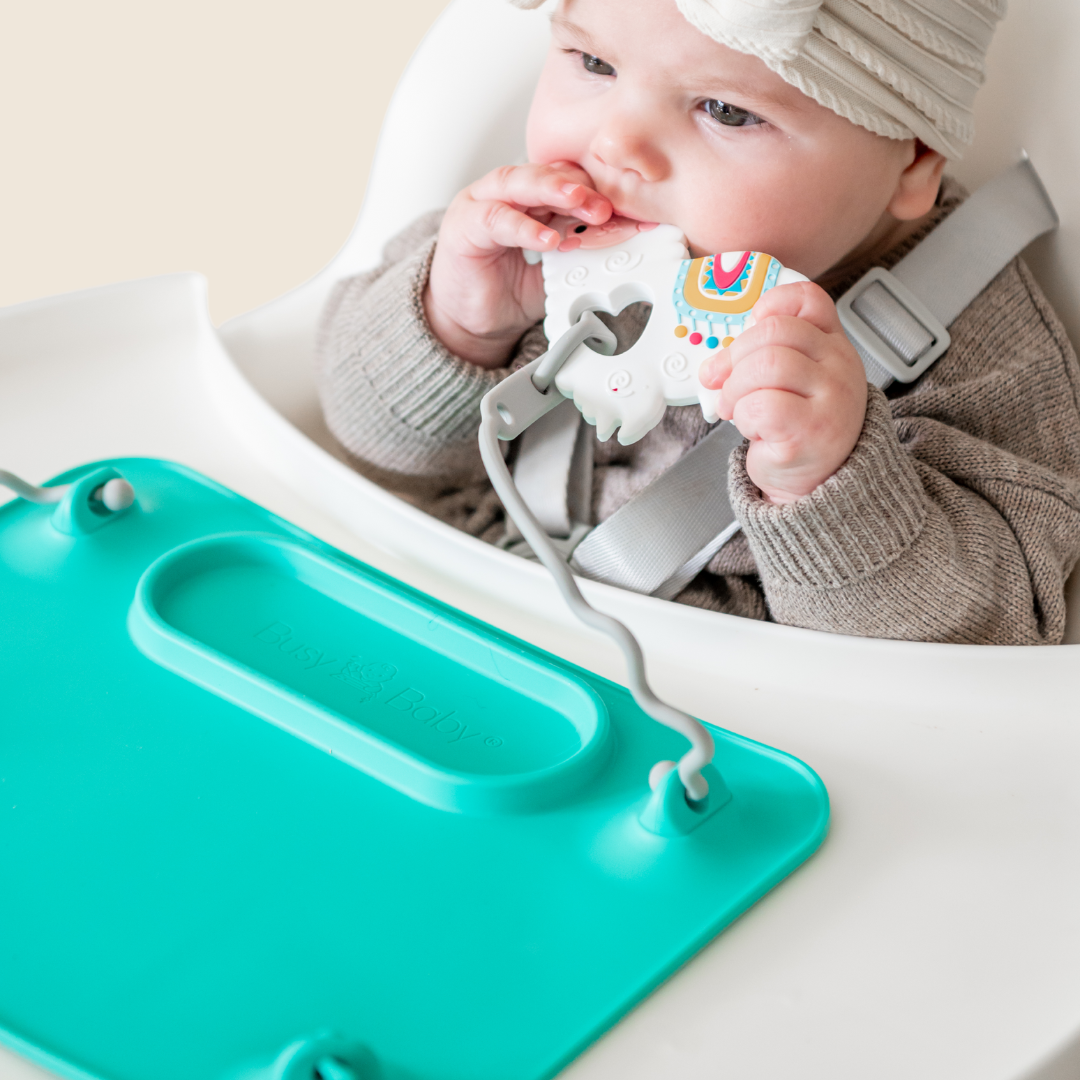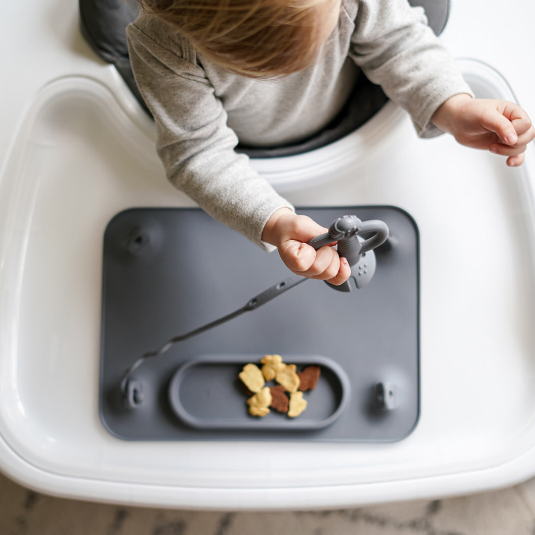 ¡Saluda a tu nuevo accesorio favorito de la hora de comer! ¡Este mantel individual de silicona es el primero en incluir tazas de succión para mantener la estera en su lugar en superficies lisas y 4 ataduras (correas de juguete) para mantener utensilios, juguetes y dientes al alcance y fuera del piso!  Úselo en casa o en la marcha con la conveniente funda de viaje.