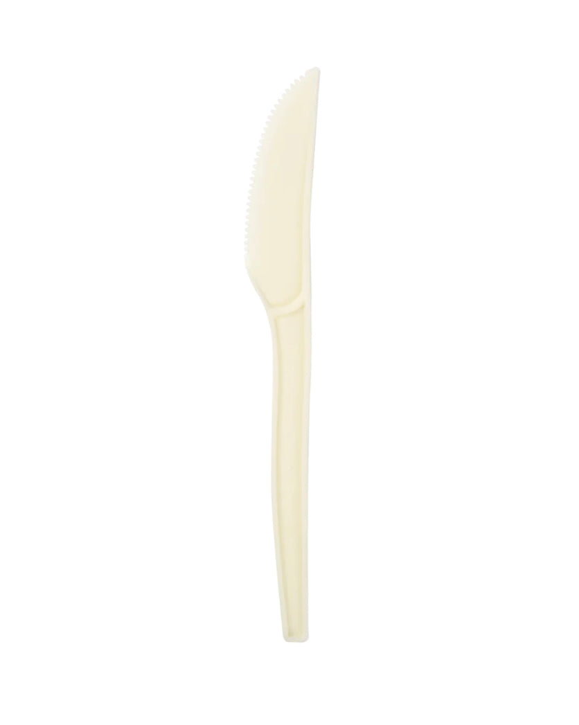 These Plant Starch or PSM Knives from PrimeWare are great for serving high heat dishes and have a high heat tolerance. They are made from plant starch material resin which is produced from corn and potato starch. PSM cutlery is made from 80% PSM and 20% polypropylene materials, which reduces the consumption of the non-renewable fossil fuels required to make conventional plastic cutlery. They are a more sustainable choice than traditional plastic cutlery which uses 100% plastic.